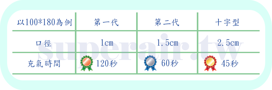 以相同氣壓條件下,同時充氣相同規格的充氣袋,因為口徑不同,充氣時間將大幅減少實際測驗出來後得: